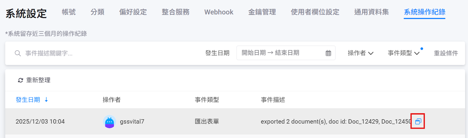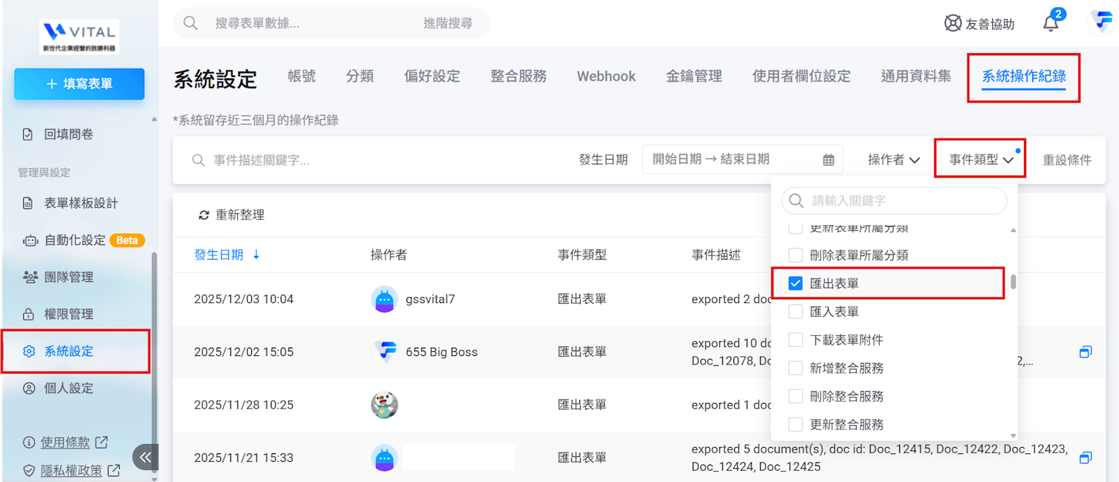 1. 系統管理員可至【系統設定>系統操作紀錄】查看匯出表單清單。請篩選事件類型:匯出表單。