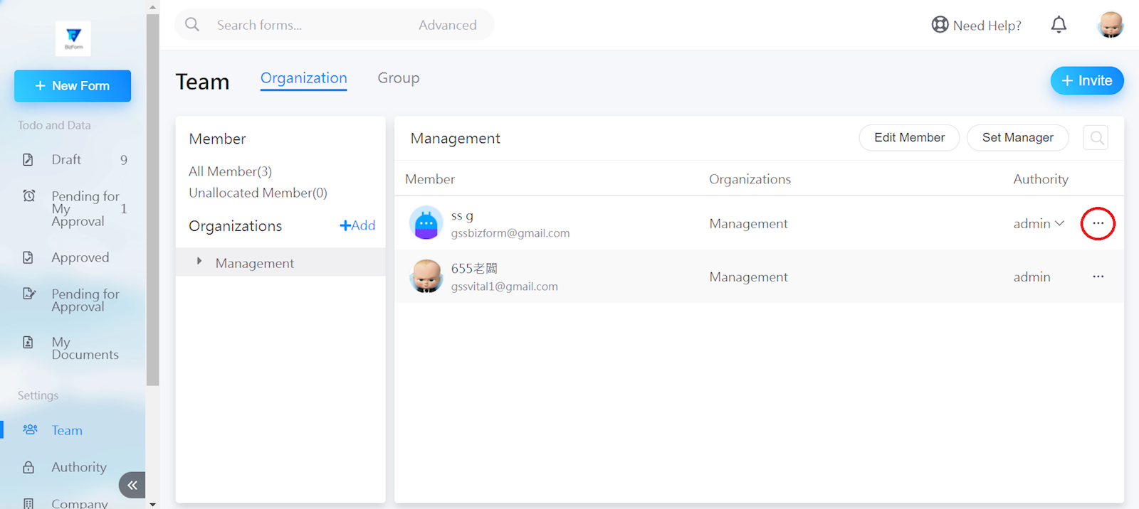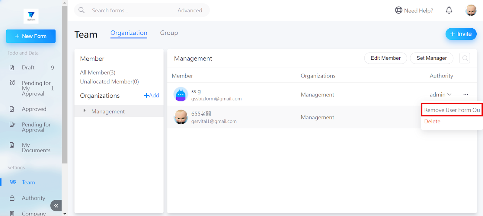 There are two ways to remove users from an organization: Method 1. Select the three dots to the right of the user. Select [Remove user form ou]. Method 2. Select [Edit member]. Uncheck the users from the box.