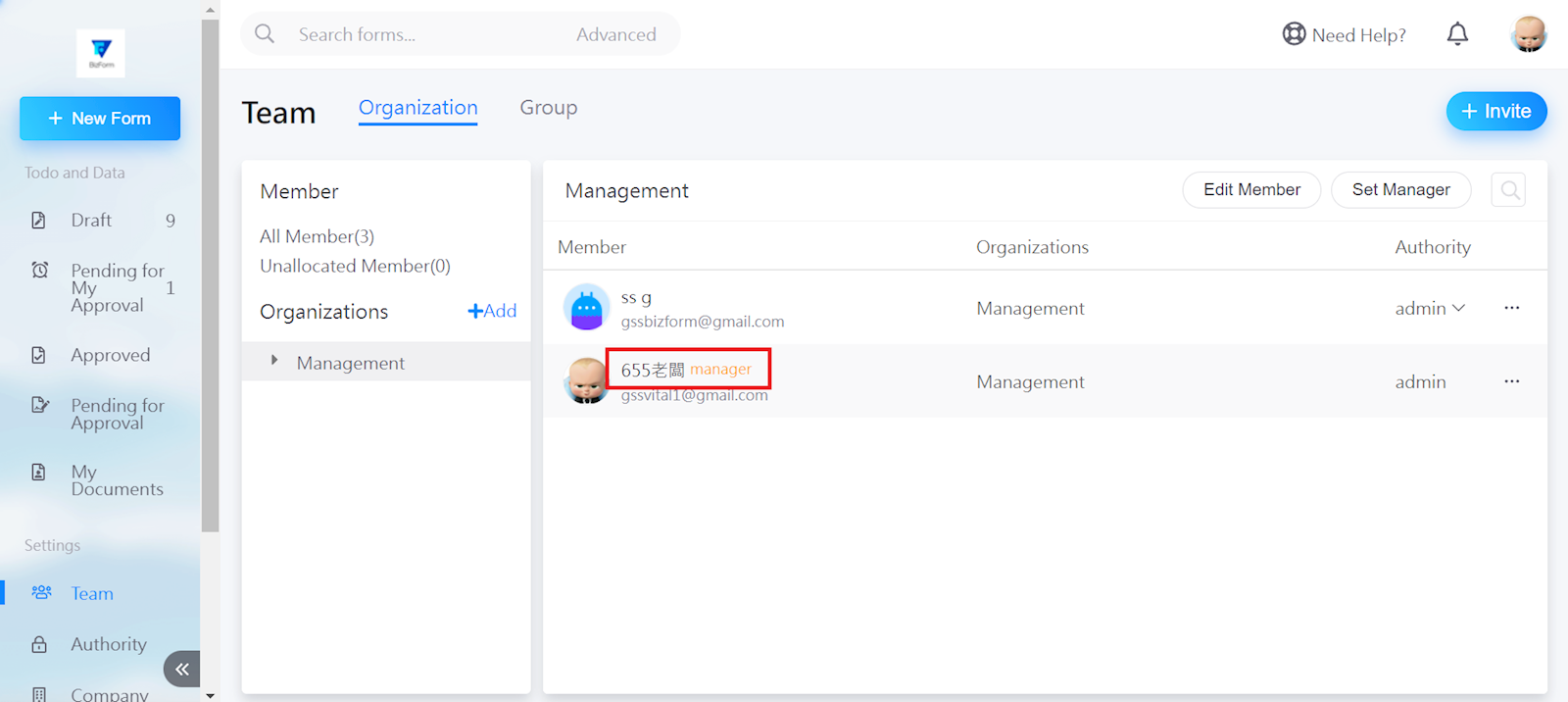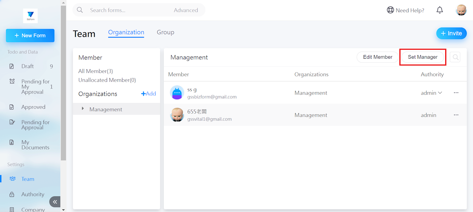 First, go to the organization interface, and select [Set manager].
