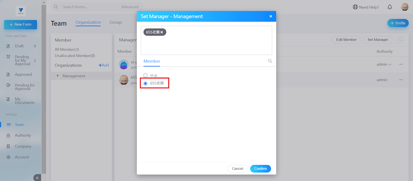 After selecting the manager, click [Confirm].