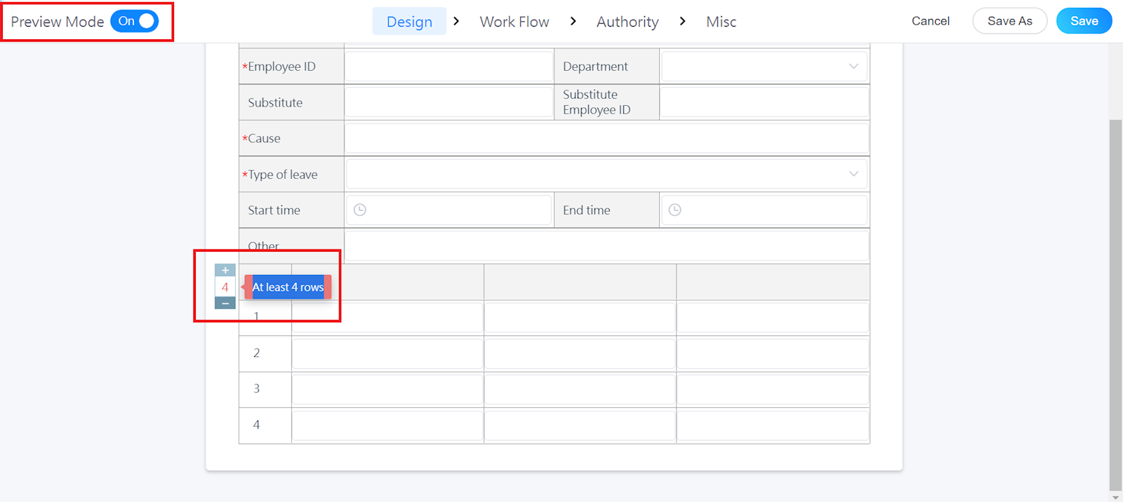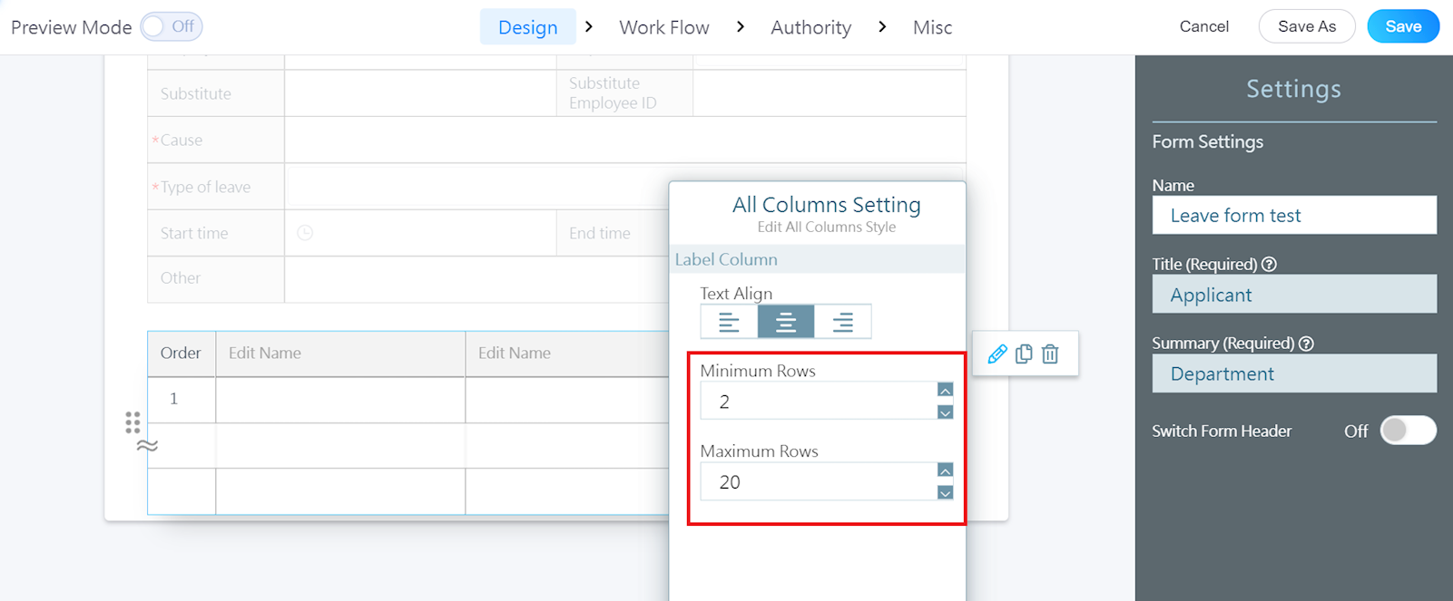 *Please note that the range of minimum rows is 1~10; the range of maximum rows is 11~20. When Preview mode is turned on, the number shown on the left is the minimum number of rows.