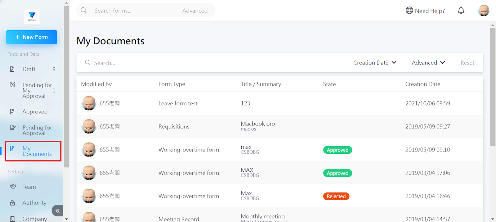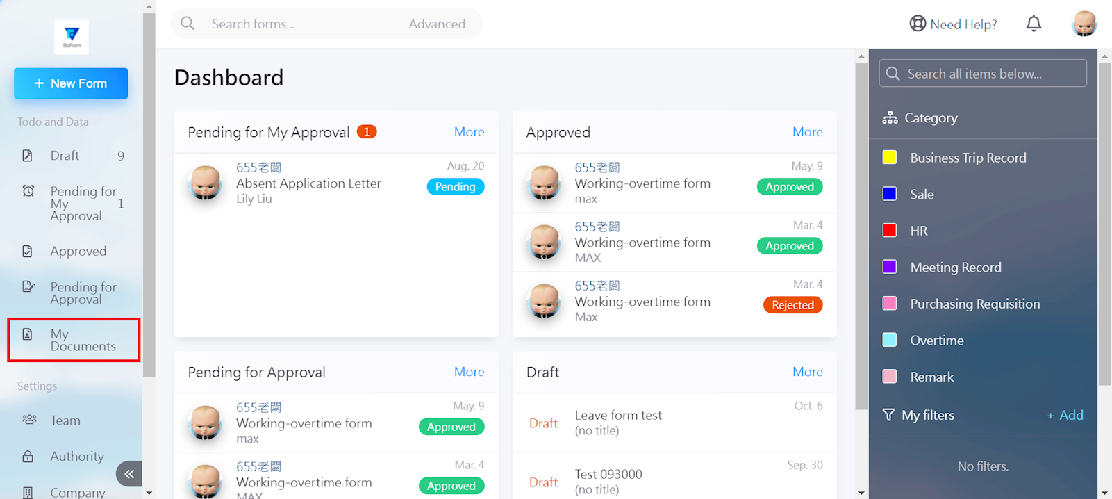 Approval forms can be viewed in the "Pending for Approval" column in the left menu, or in the "Pending for Approval" field on the homepage. General forms can be viewed in "My Documents" in the left menu on the homepage.