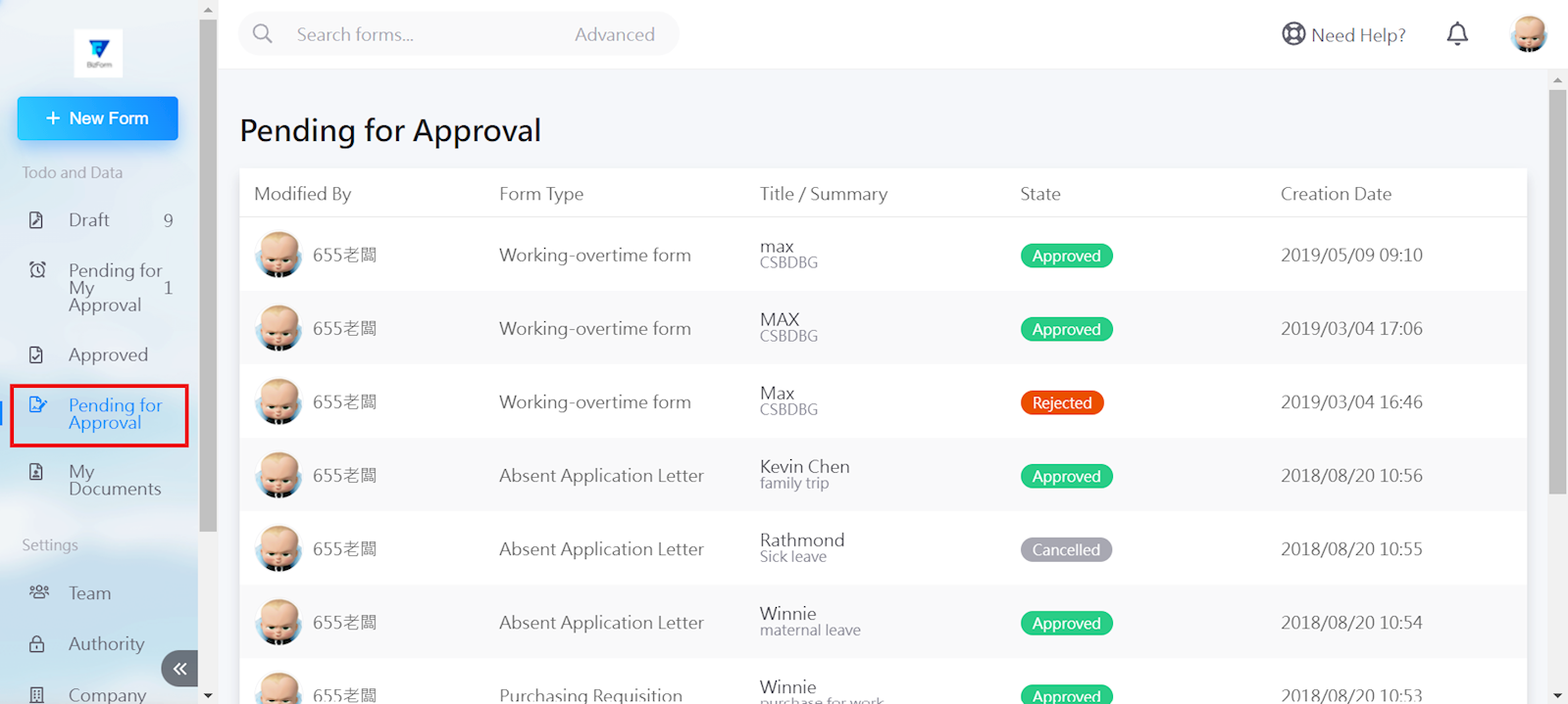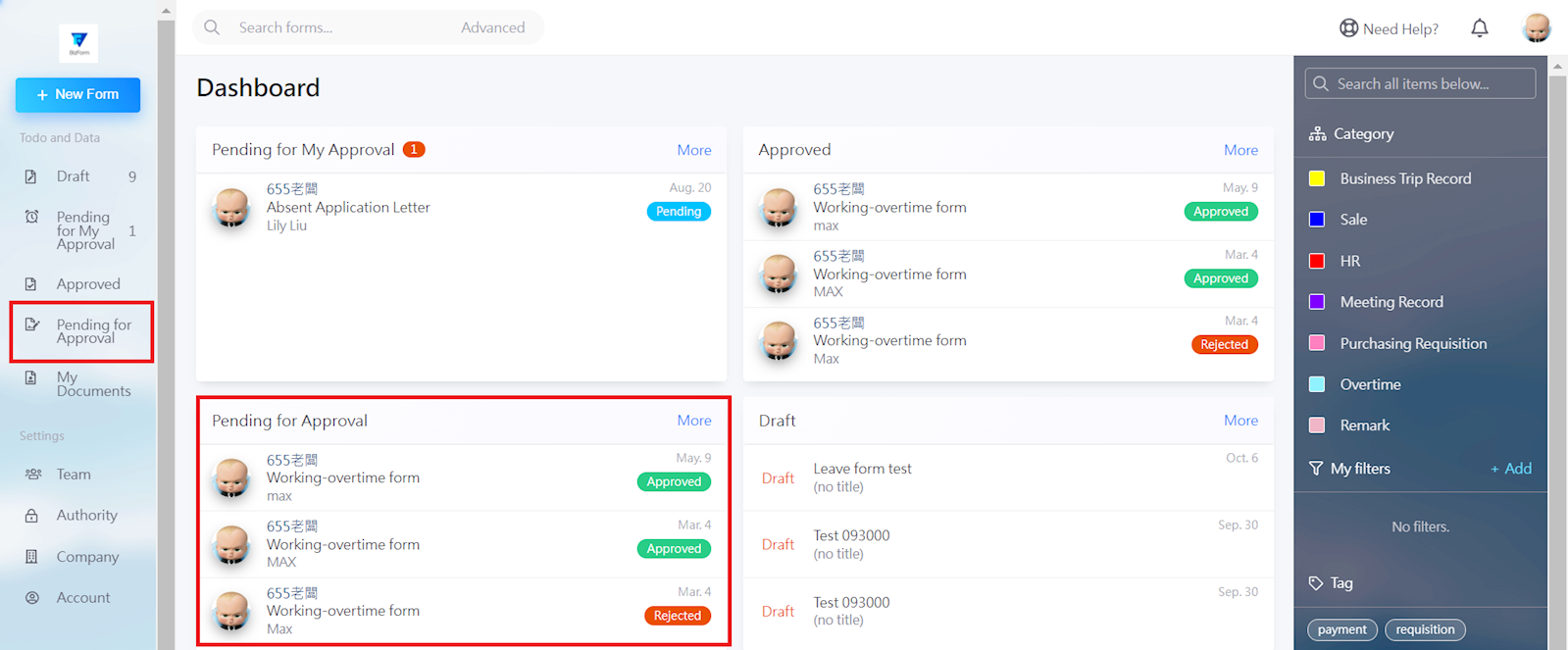 Approval forms can be viewed in the "Pending for Approval" column in the left menu, or in the "Pending for Approval" field on the homepage.