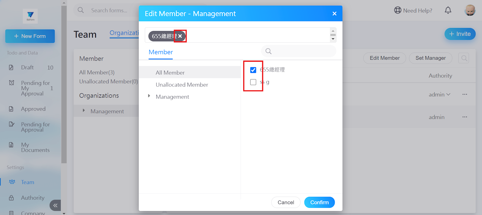 Click the [X] next to the member's name, or uncheck the member from the box to the right to remove. Then, click [Confirm].