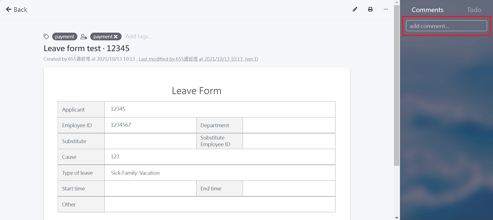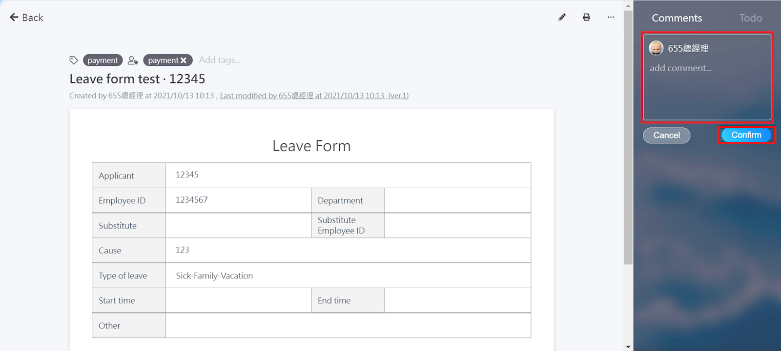 Click [Add comment] to enter your content. Once finished, select [Confirm].