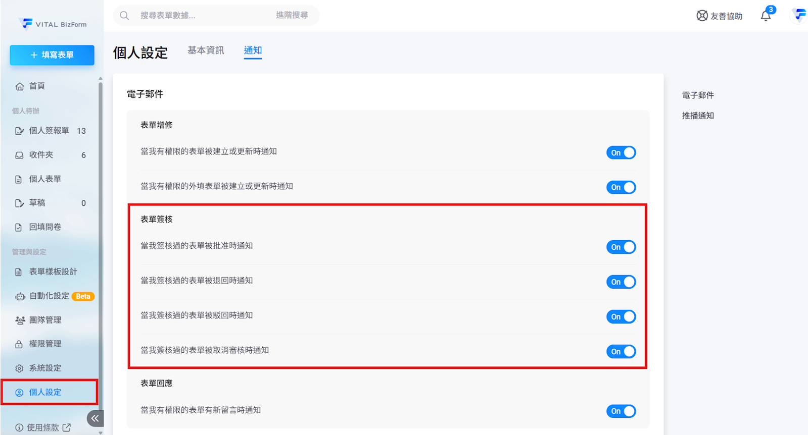 除了表單的申請人會收到通知,若使用者在【個人設定】>【通知】,⌈表單簽核⌋項目下的"當我簽核過的表單被駁回時通知"開啟通知,系統將自動通知使用者,無論表單是被批准、退回、駁回還是取消審核。