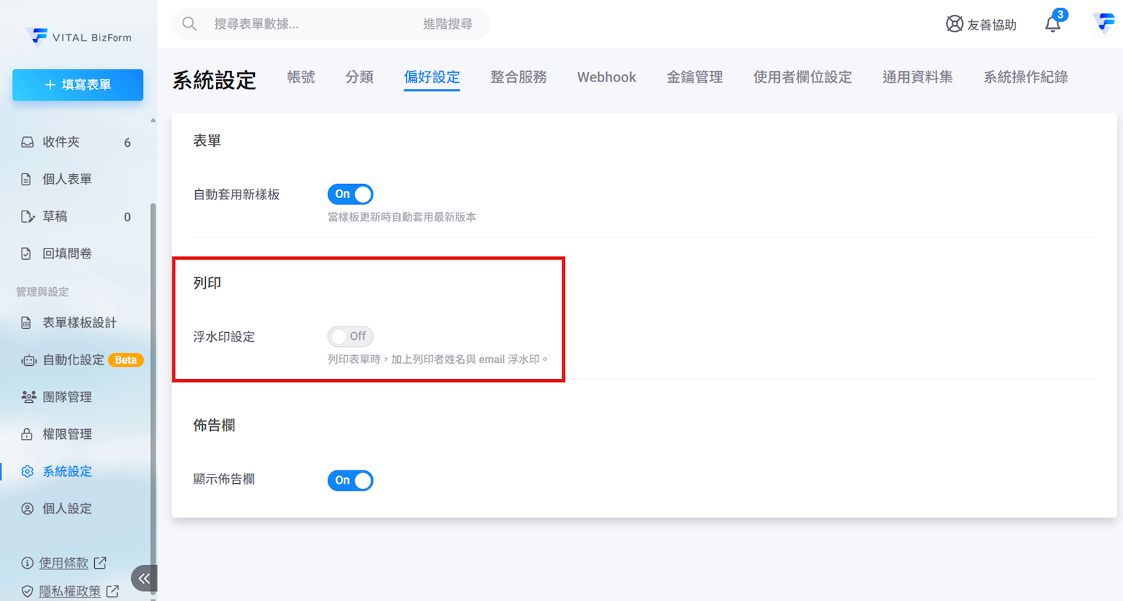 請由左方功能列表中的「企業設定」進入,並選擇「列印」,將「浮水印設定」按鈕開啟。