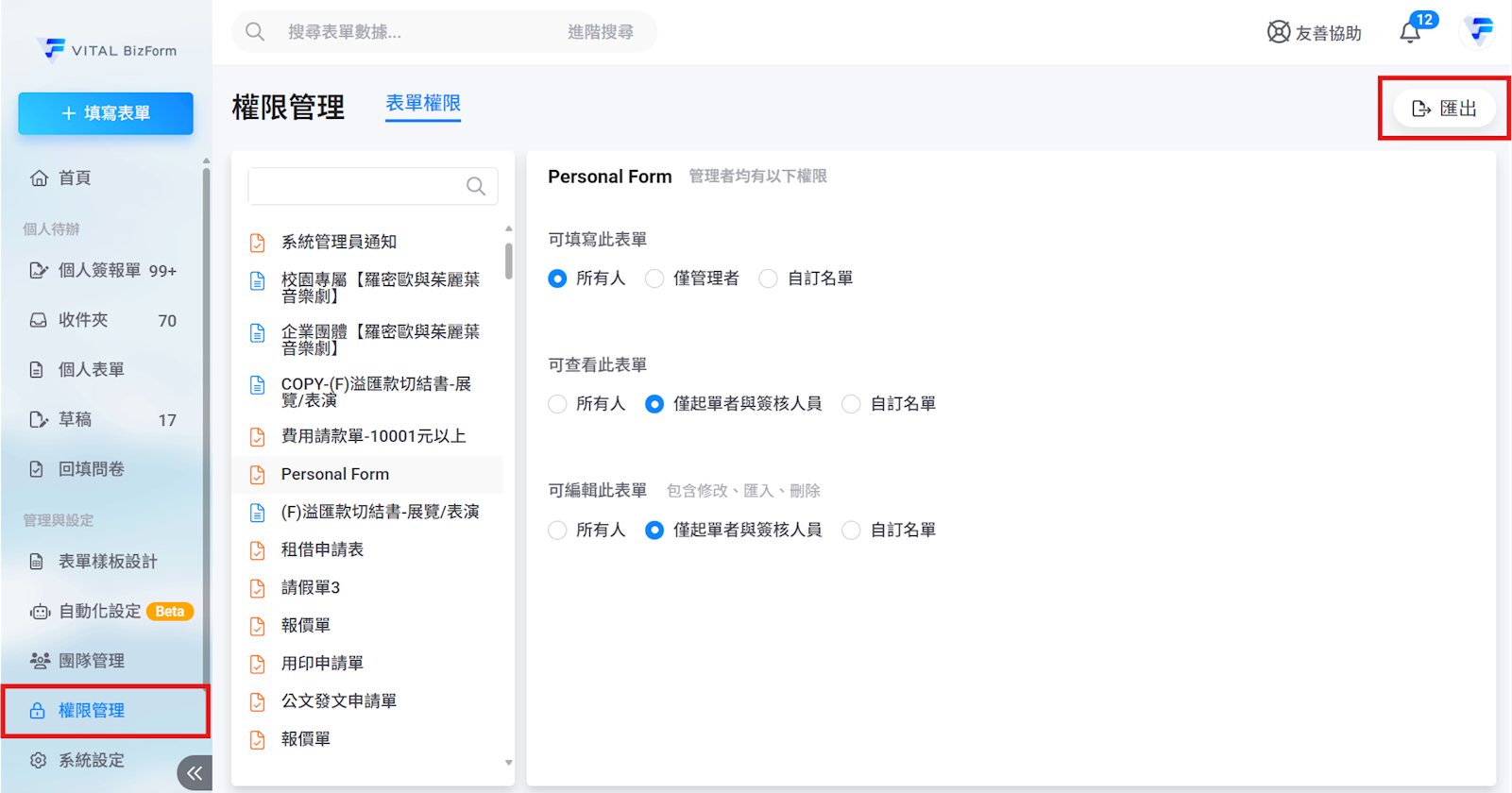 點擊左側功能選單的【權限管理 > 匯出】,即可將所有樣板的權限匯出成 Excel 檔。