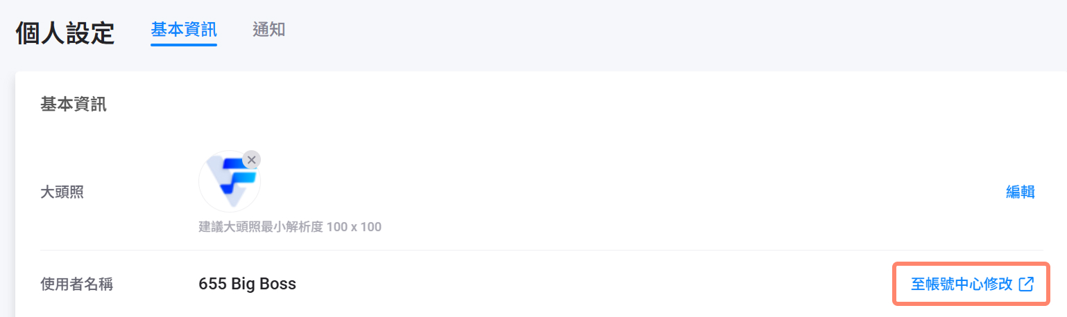 1. 請至【個人設定】>【基本資訊】的使用者名稱後方點選【至帳號中心修改】進行名稱變更。