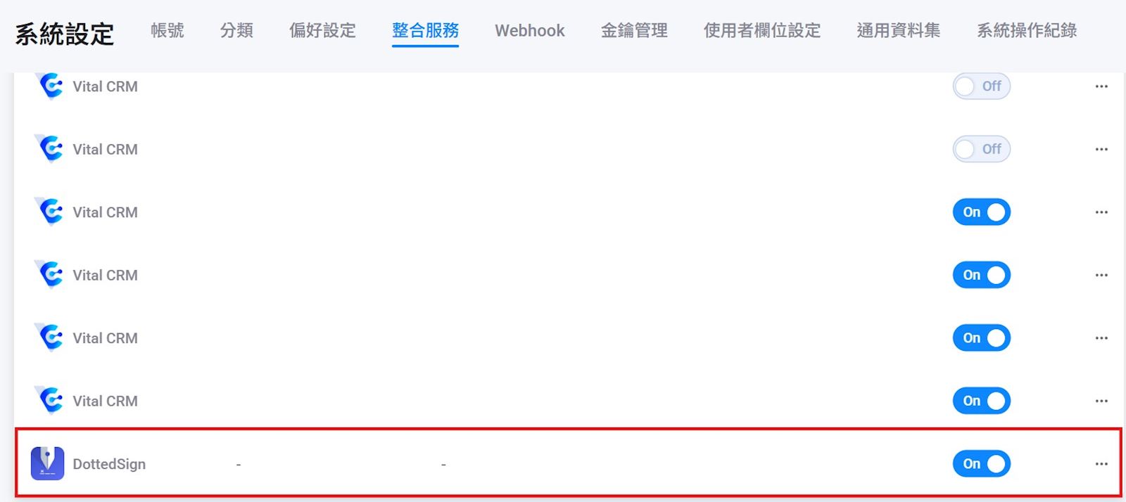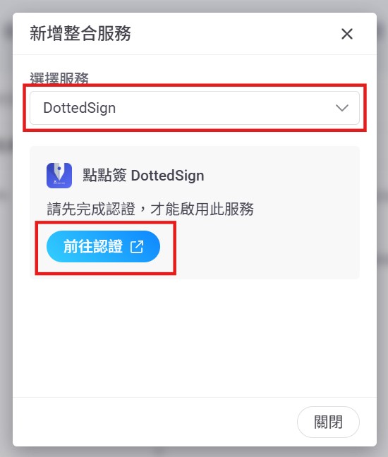 2. 下拉選擇【DottedSign】,點選【前往認證】。至點點簽平台完成認證後,即可在整合服務列表中看到【DottedSign】。