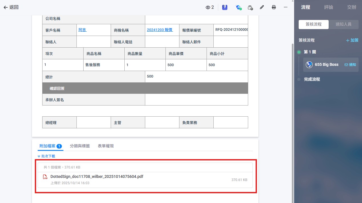 2. 若要下載簽署文件PDF,請至表單下方【附加檔案】,可點擊文件進行預覽、批次下載。