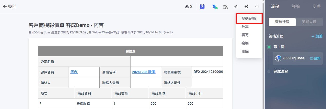 1. 請進入表單閱讀模式,點選右上角【 ... >發送紀錄】,即可查看發送紀錄。