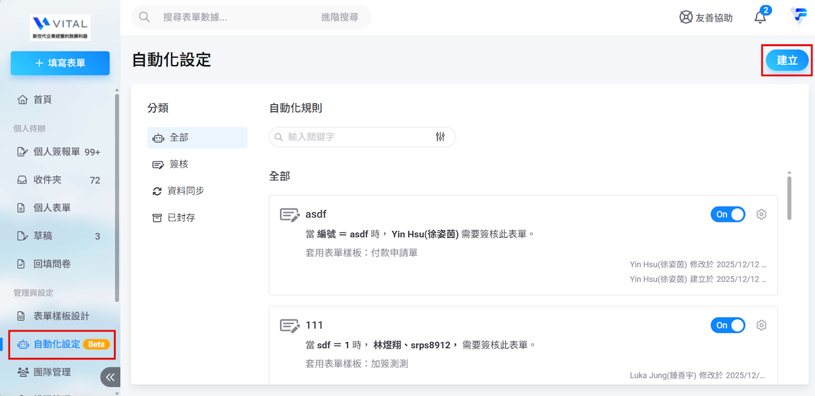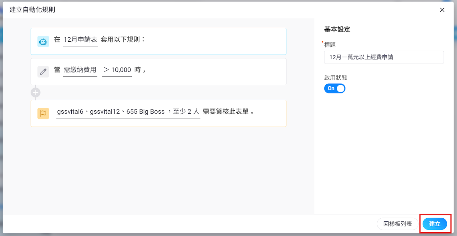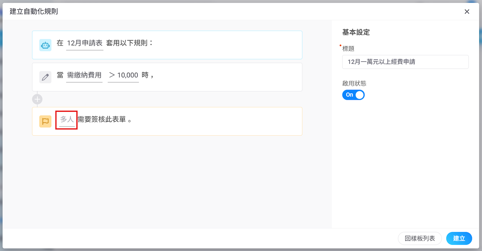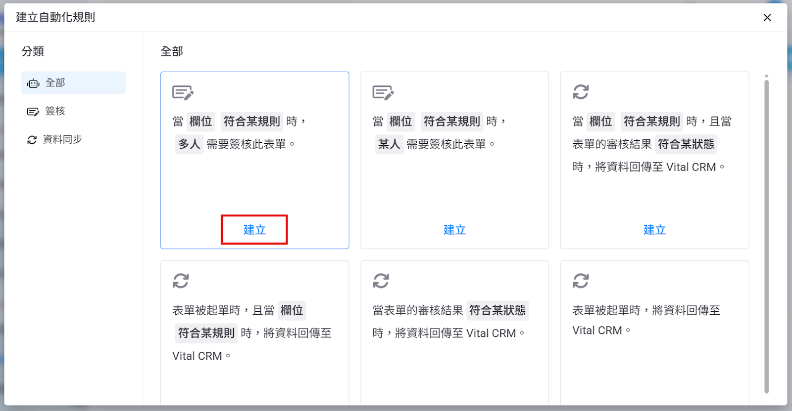 2. 選擇"多人簽核"的自動化規則,點選【建立】。