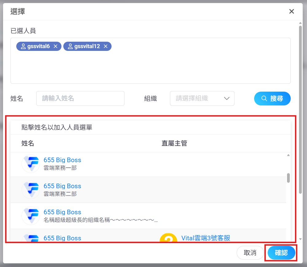 4. 點選【選擇】,並點擊姓名加入人員後點選【確認】。