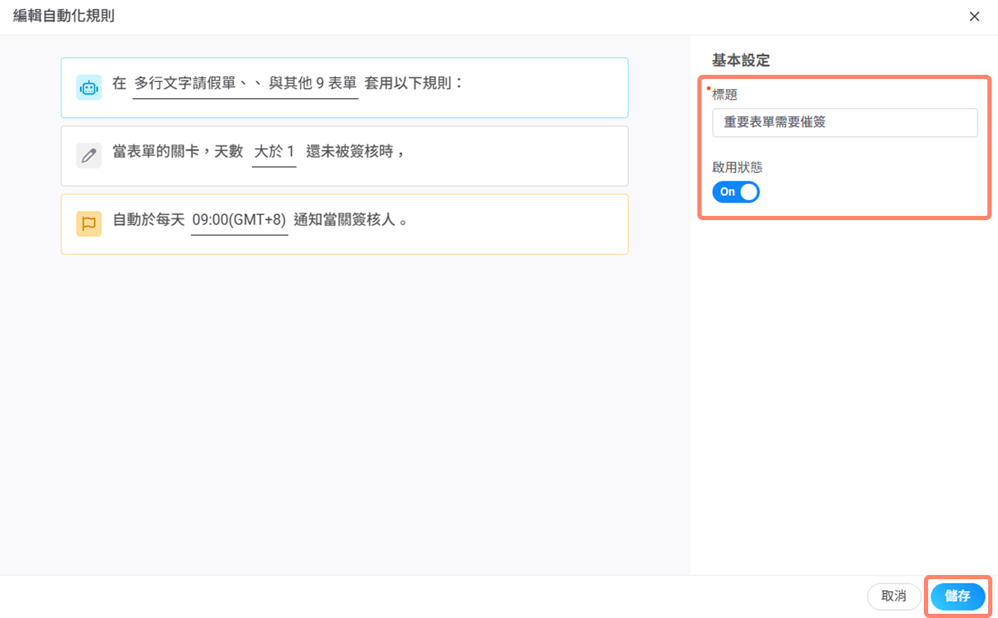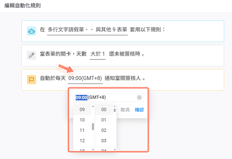 3. 請選擇要套用自動催簽卡片的"表單"(可選多張表單)、"天數"、"通知時間"。