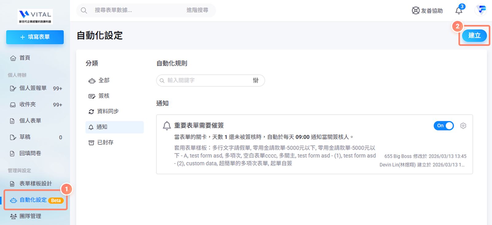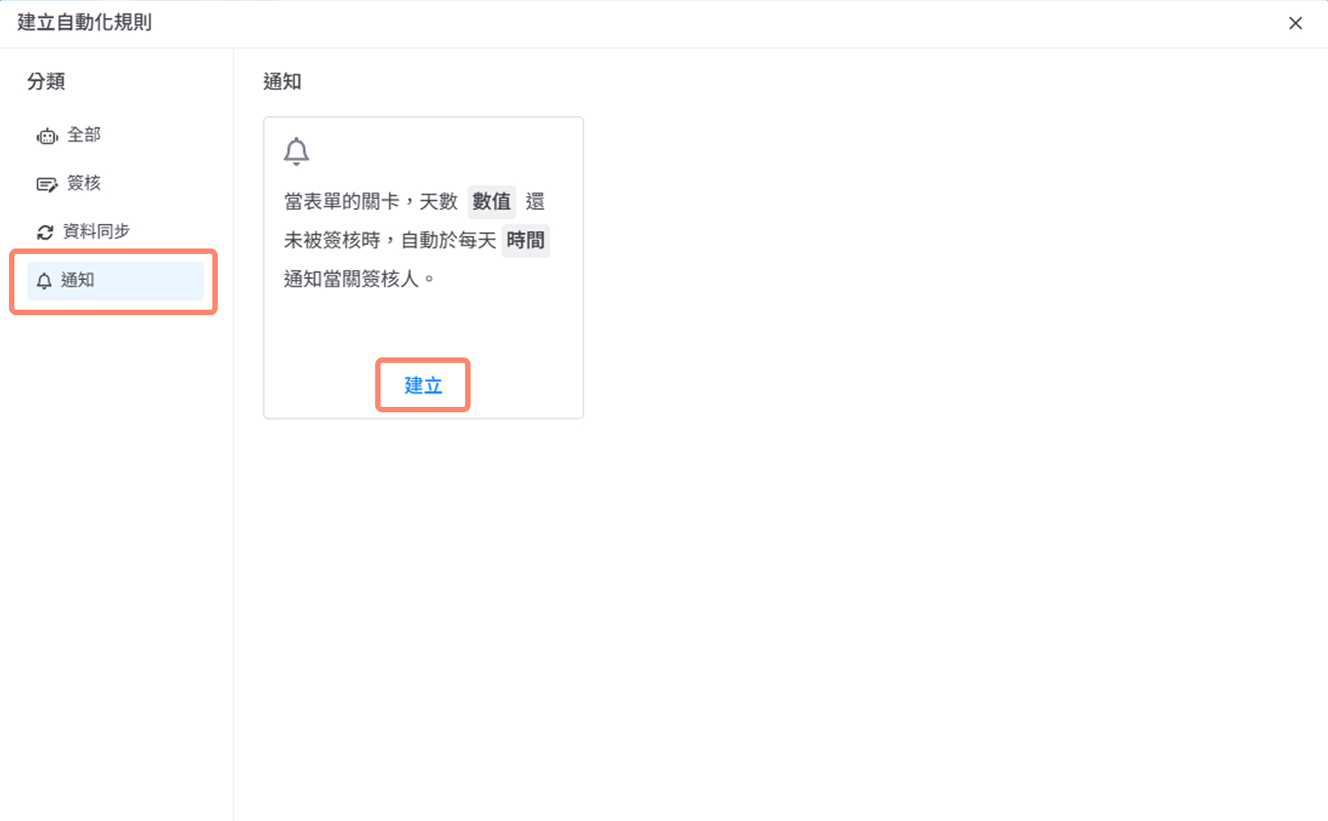 2. 點選【通知】分類,會看到催簽的卡片,點選【建立】。