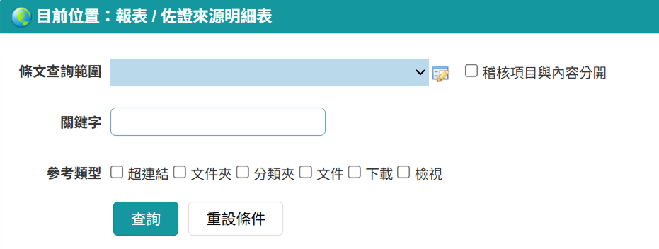 一、佐證來源明細表報表,新增「條文查詢範圍」條件