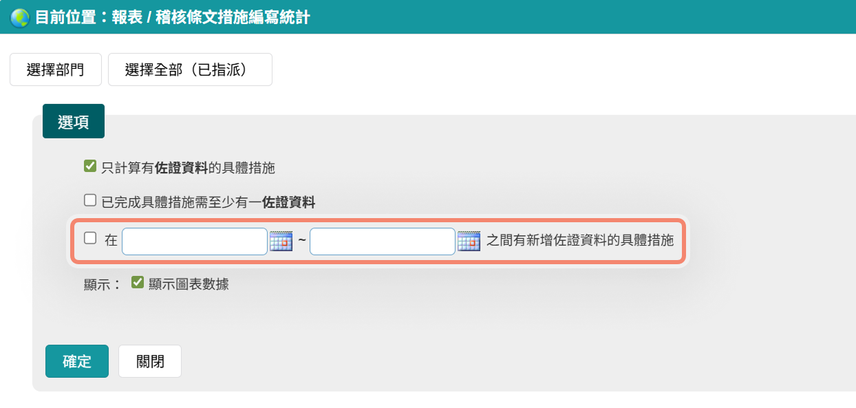 三、稽核條文措施編寫統計報表,增加「查詢特定日期區間內有新增佐證資料」的條件