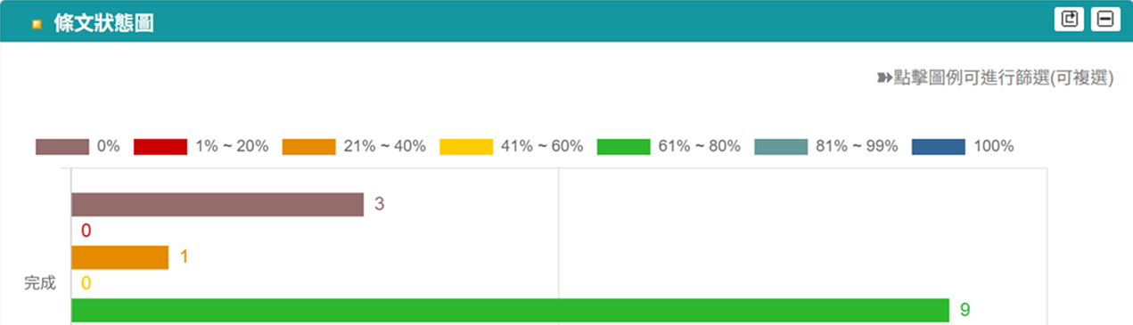 首頁 / 條文狀態圖表,額外提供 0% (未開始) 和 100% (已完成) 兩種狀態的條文統計計算,讓使用者可一目瞭然地掌握條文的進度概況。