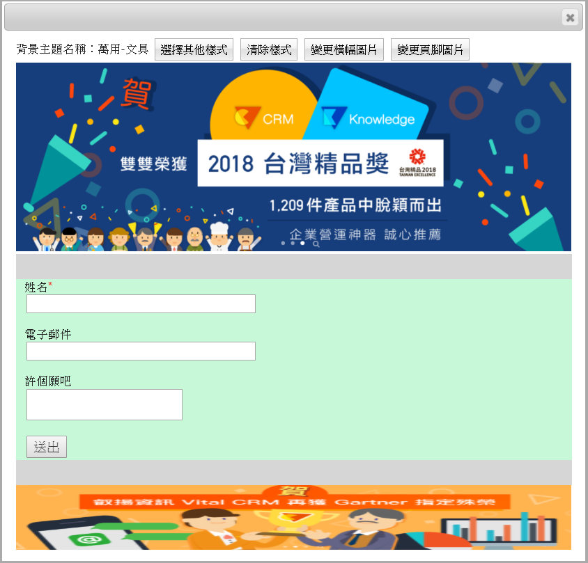 於客戶資料回填表編輯畫面套用背景主題時,可以自由替換橫幅與頁腳圖片。