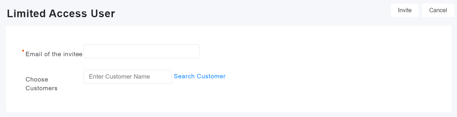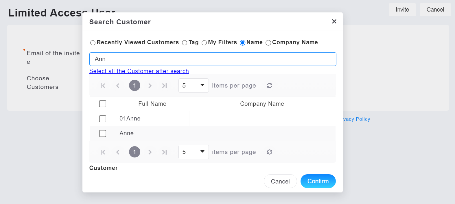3. Enter the invited person's email and search for associated customers. Click "Search Customers" to perform searches based on "Recent Browsing History," "Tags," "My Filters," "Customer Name," or "Company Name."