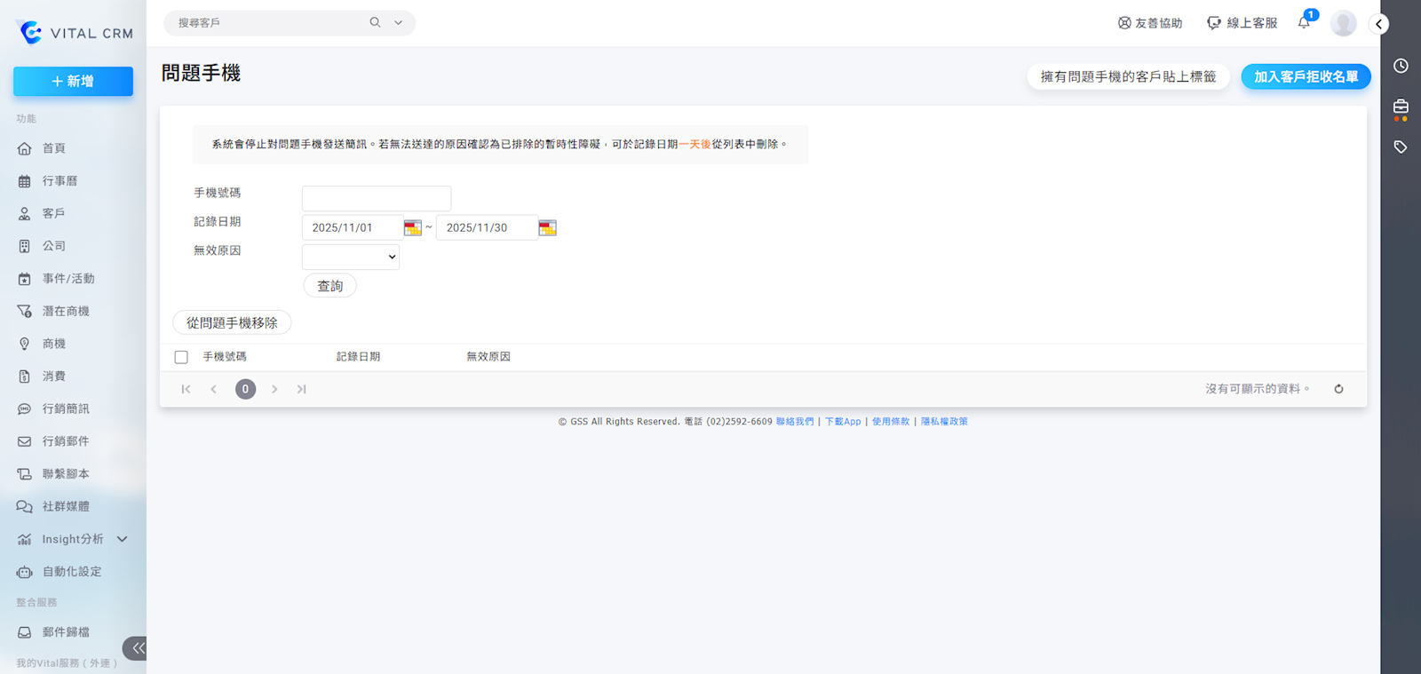 從【管理>資料>問題手機】進入,即可查看問題手機。客戶的手機號碼被加入至【問題手機】名單中,系統將停止向該手機號碼發送所有簡訊。