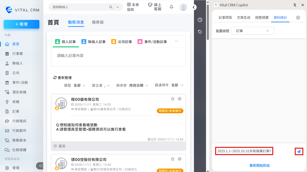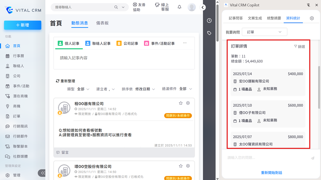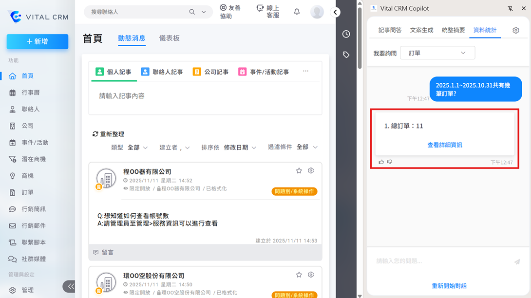 *情境說明:系統依據設定條件與輸入的prompt,快速彙整出某時間段的訂單數量,也提供查看詳細資訊。