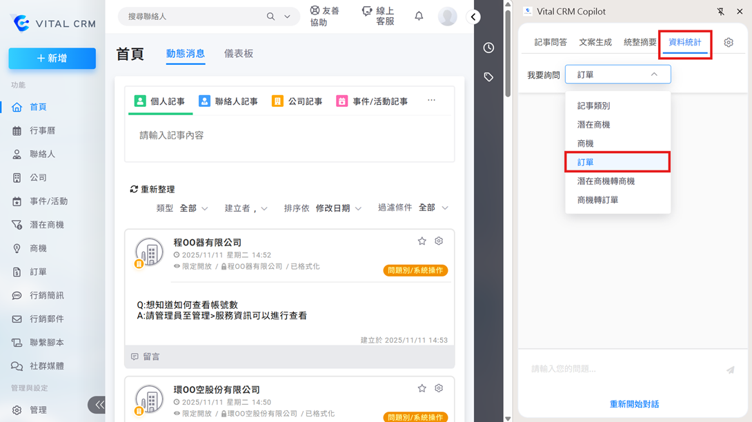 1.點選【資料統計】,下拉選擇要統計的資料類型 (此處以"訂單"為例)。