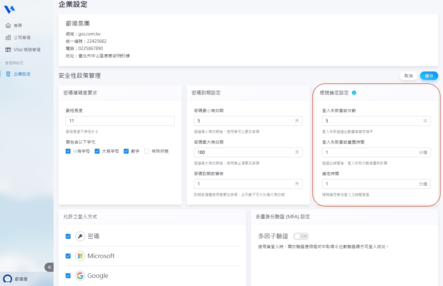 4. 【帳號鎖定設定】可自行規範登入失敗鎖定的次數、重置錯誤次數的時間、鎖定時間。