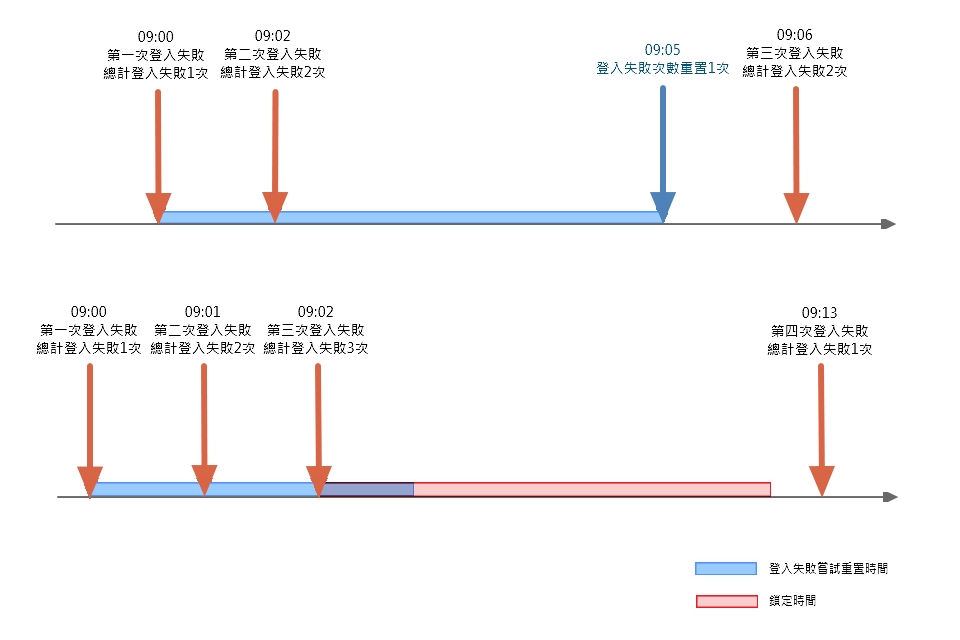 設定條件:登入失敗嘗試次數3次/登入失敗嘗試重置時間5分鐘/鎖定時間10分鐘