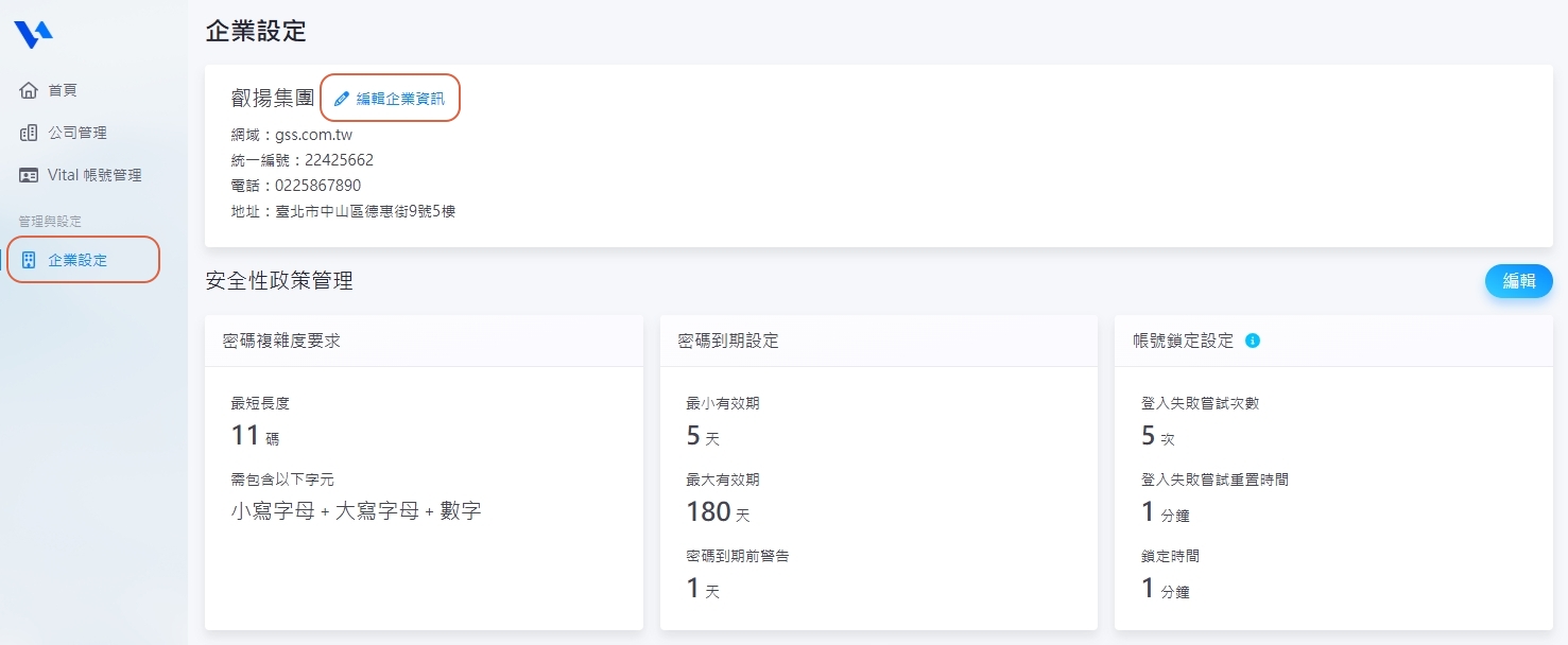1. 請至【企業設定】將游標靠近公司名稱,即會出現【編輯企業資訊】按鈕,點選進入。