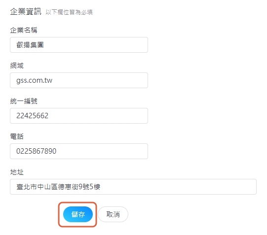 1. 請至【企業設定】將游標靠近公司名稱,即會出現【編輯企業資訊】按鈕,點選進入。 2. 請輸入資訊後點選【儲存】即完成。