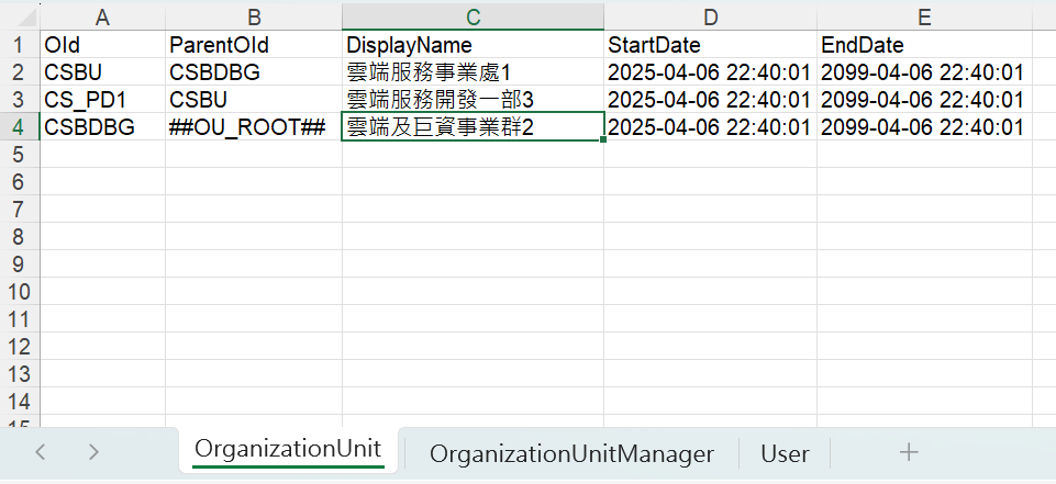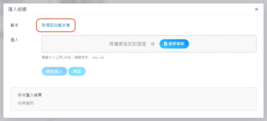請先點選【取得空白範本檔】下載 excel 並填寫三個分頁資料:組織(Organization Unit)、組織管理員(Organization Unit Manager)、成員(User)。填寫完成後再回到此處匯入檔案即可。