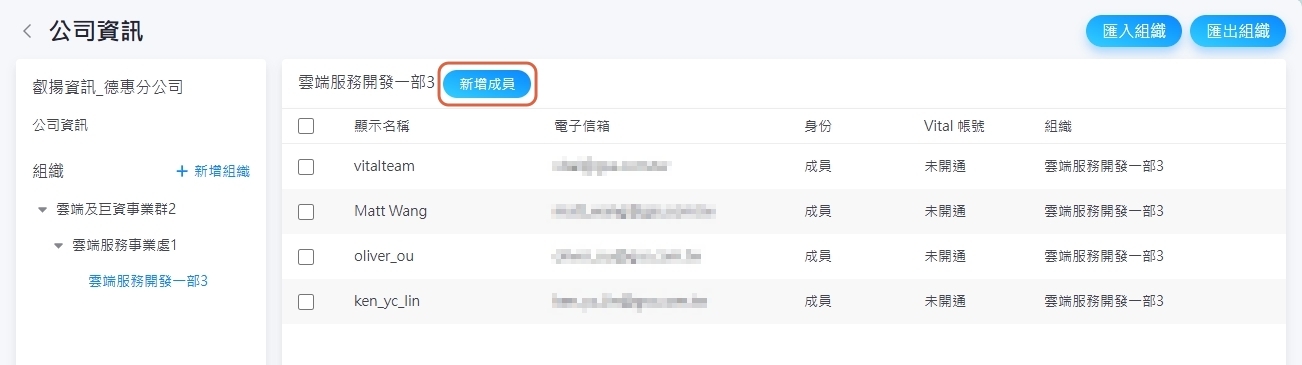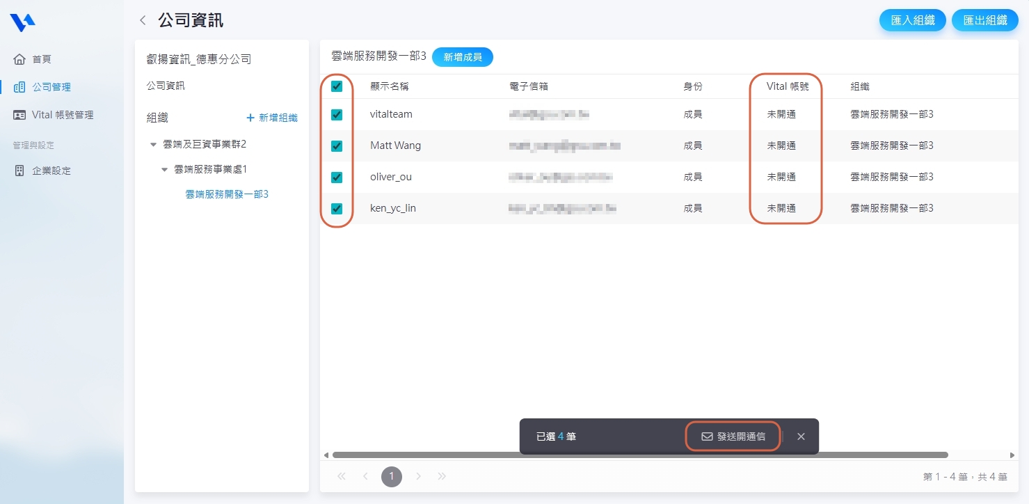 將成員新增完成後,請勾選"未開通"帳號,點選【發送開通信】後請成員至信箱收信進行開通,即可從一般 Vital 帳號變成企業用戶帳號。