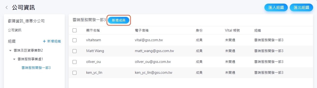 *每個 Vital 帳號可重複加入多個公司組織,在每個組織中都需要進行開通。