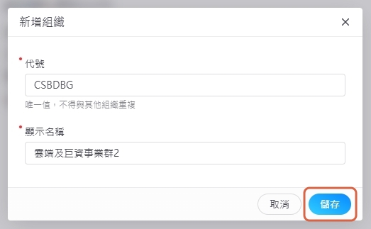 請填寫【代號】、【顯示名稱】後點選【儲存】即完成。
