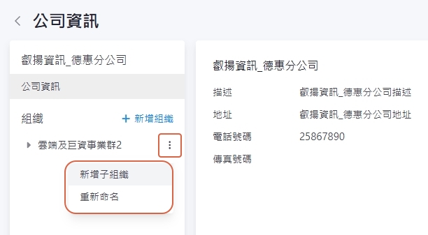 點選組織後方【...】可新增子組織或修改組織名稱。