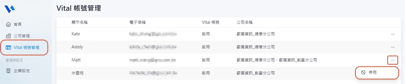 此處可看到公司所有的 Vital 帳號資訊,點選帳號後方【...】>【停用】可將帳號停用。