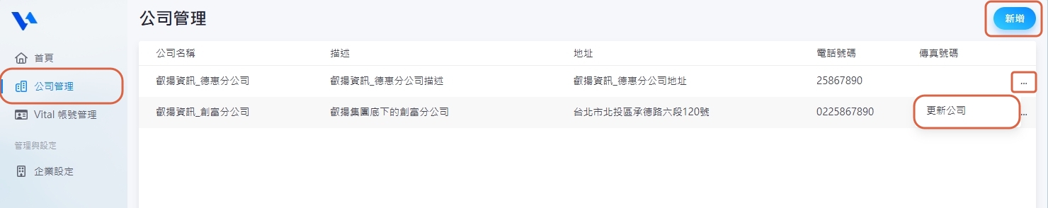 請至【公司管理】查看所有公司資訊,點選【新增】可新增一筆公司資料,點選公司後方【...】>【更新公司】可編輯公司資料。