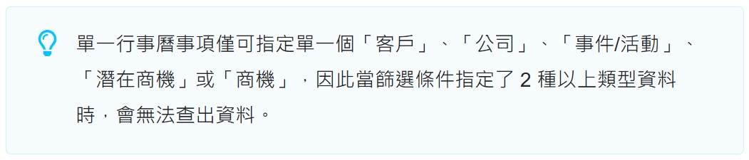 在行事曆進階查詢的功能中,可使用「公司」、「事件/活動」、「潛在商機」與「商機」等條件來查詢相關的待辦工作。