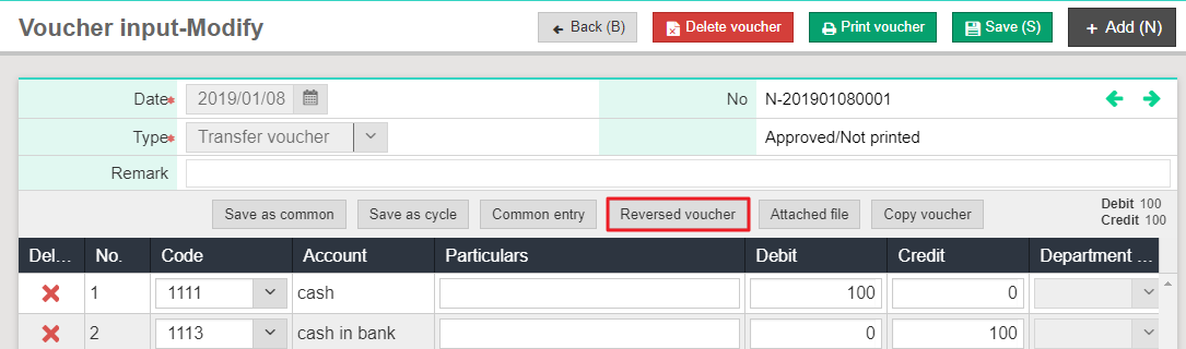 1. Reverse the voucher of November and search for the voucher in [Voucher input] and click [Reversed voucher]. The system will copy a voucher of last month, and change D/C, then put it in November.