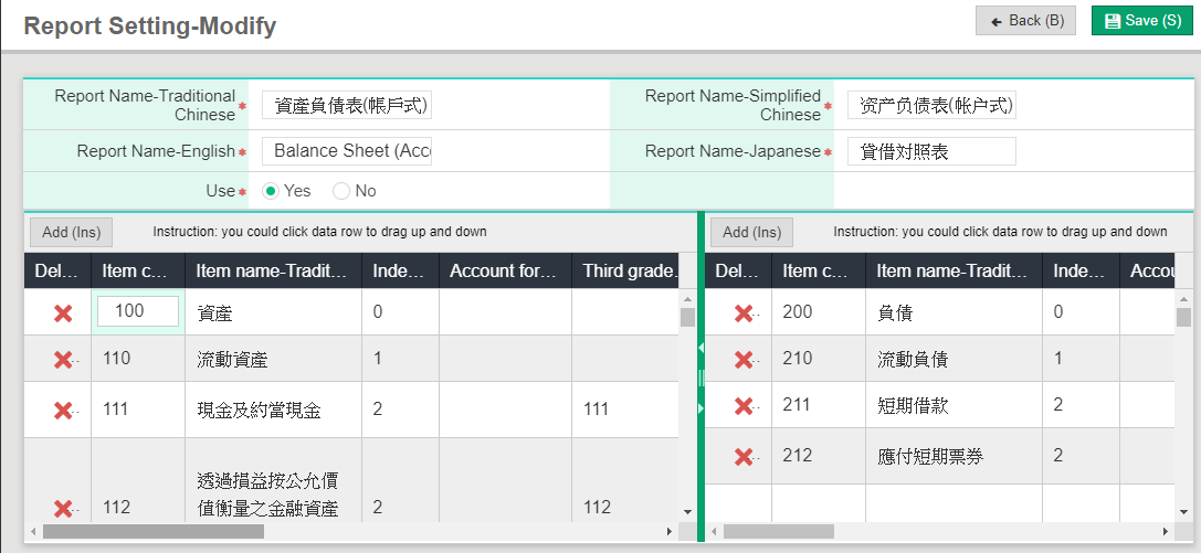 Account Formula:Able to input corresponding account code or formula to the item.