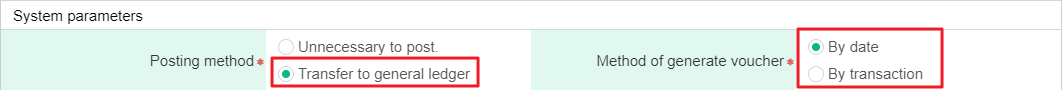 1) Please go to [Maintenance> Parameter setting], and check [Transfer to general ledger] to posting method and [By date] or [By transaction] of method of generate voucher.