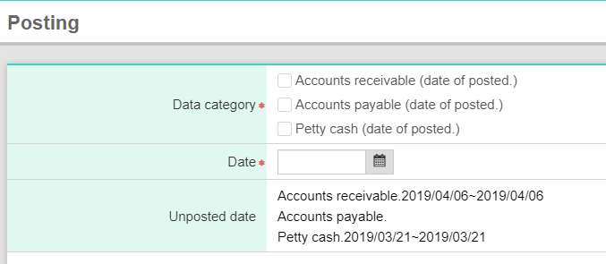 1) Please go to [Daily work>Posting], and check [Data category] and [Date] you would like to deal with.