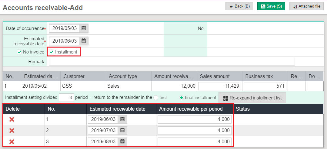 2. Check [Installment], and you could start setting up the number of period and installment list.