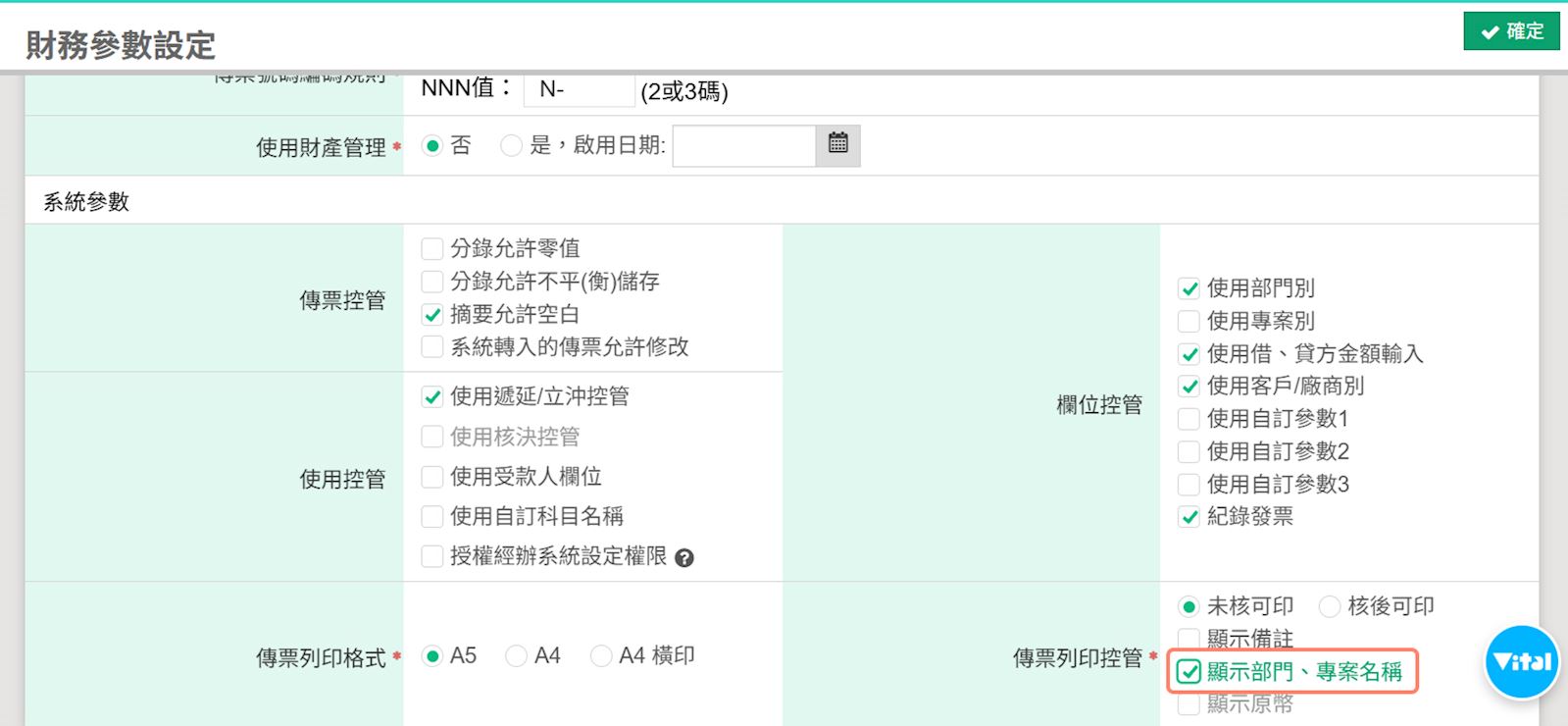 如何設定於傳票列印格式中顯示部門、專案名稱?