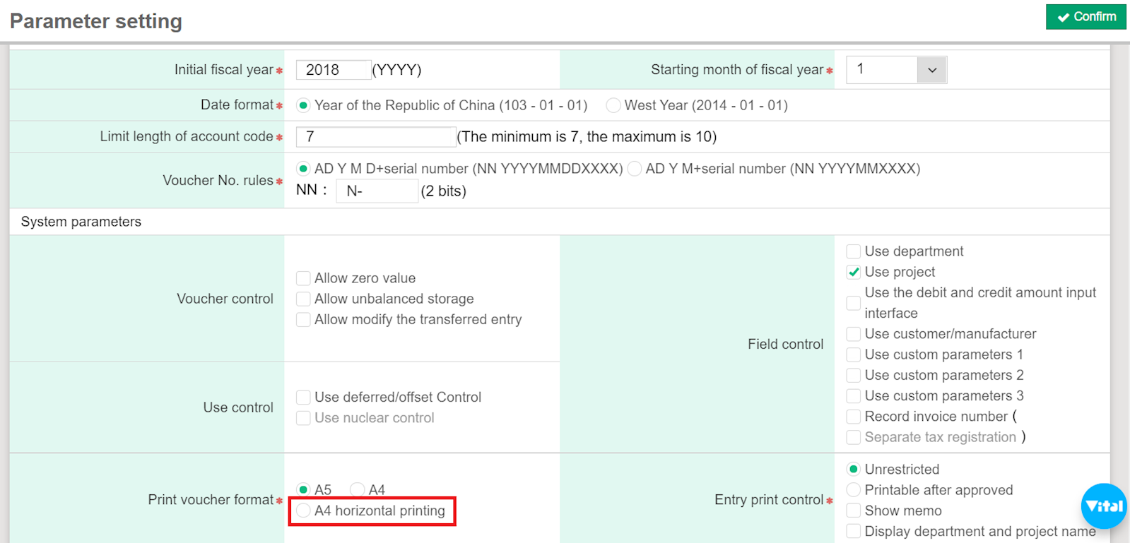 Go to [Maintenance] > [Parameter setting] > "Print voucher format" section to check "A4 horizontal printing."