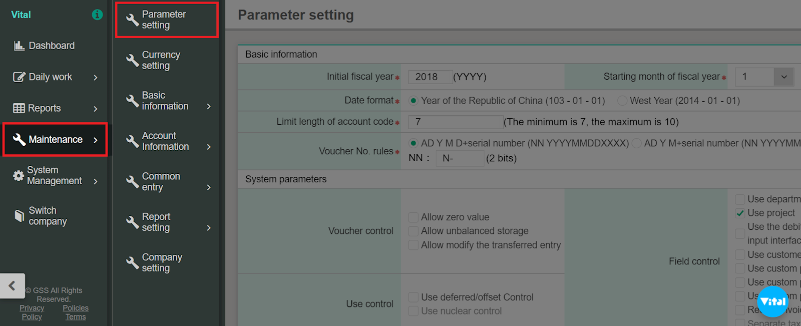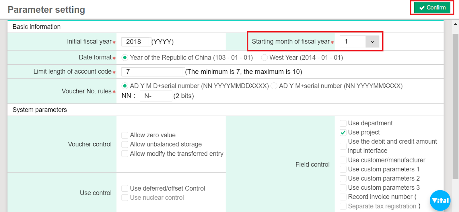 The system financial year is set by default as calendar year (1/1~12/31). Change the starting date in the [Parameter setting].