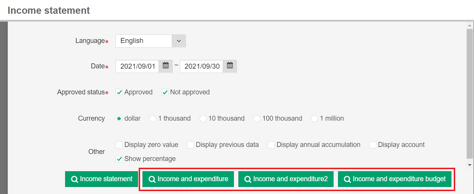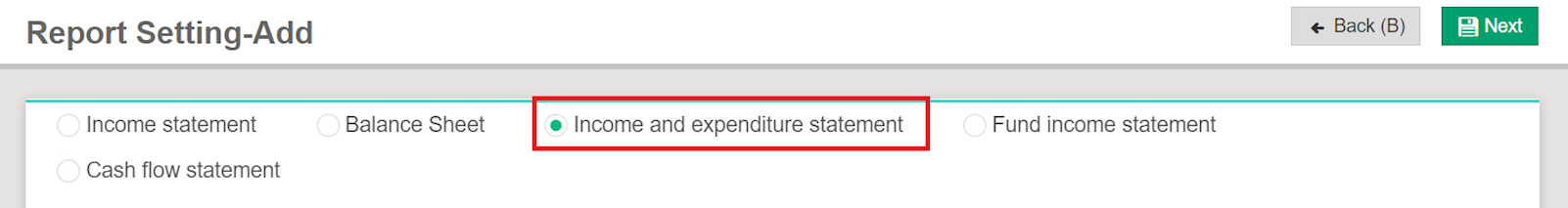 Add an "Income and expenditure statement" in Report settings, and the income and expenditure statement and budget options will be shown in the "Income statement" for viewing.