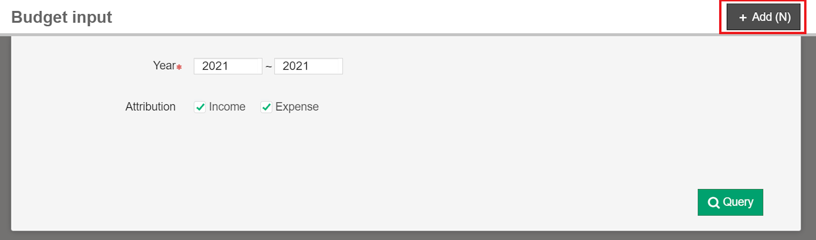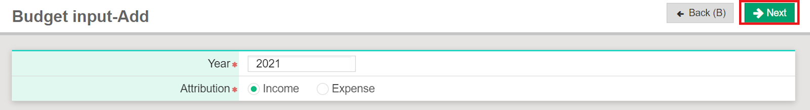 Select [+Add] to set up budget. Select the year and attribution, and click [Next]. Select department budget, and click [Next]. After entering the number, click [Save] to finish.